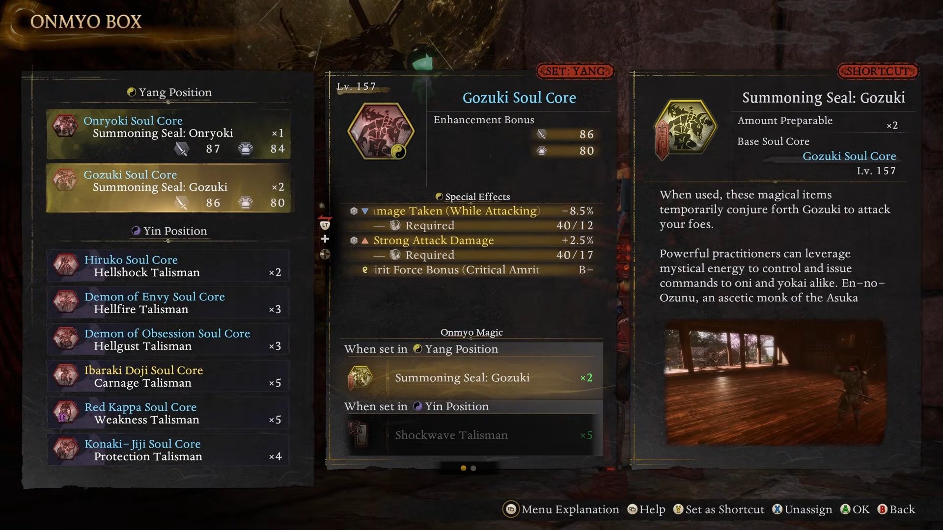 Soul cores: Roki/Gouki (8.5% damage taken while attacking), Hero (Hellshock), Envy (Hellfire), Obsession (Hellgust), Ibaraki (Carnage), Redcap (Weakness), Konaki-jiji (Protection Talisman—negates ~3k damage flat).