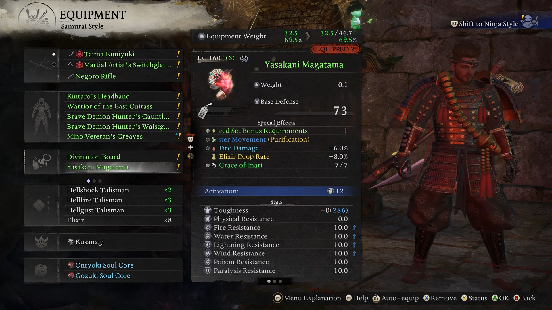 | Core Grace | Double Inari (7 pieces total) on weapons, boots, accessories, Yasakani |