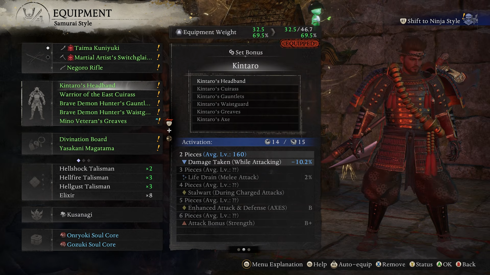 Warrior of the West chest (8.2% martial arts) and Kintaro’s headband (10% damage reduction while attacking).