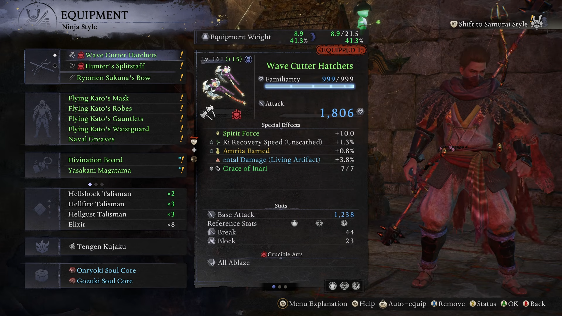 Mirror Samurai with Inari on ranged weapon, both weapons (aim Crucible Inari Tonfas or Split Staff), boots, Yasakani, and accessory. Fill head/chest/gloves/waist with Kado Flying Kado for ninjutsu gauge charge, Shadow Arts damage, spirit force backstab, and elemental boosts.