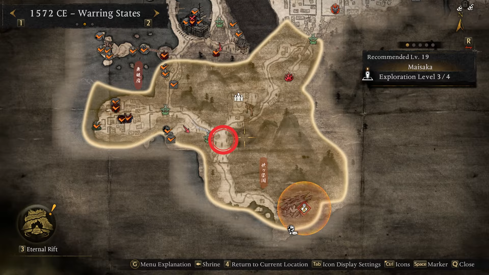 Head to the southeastern Warring States map in the Maisaka region, where a tight forest clearing sits right beside the Maisaka Junction shrine—activate it first for quick respawns. Spot the yokai near some trees and a Sudama; sneak up for a stealth backstab if undetected. In Heian era, another spawns in Rokuhara’s Lesser Crucible for repeated farming.
