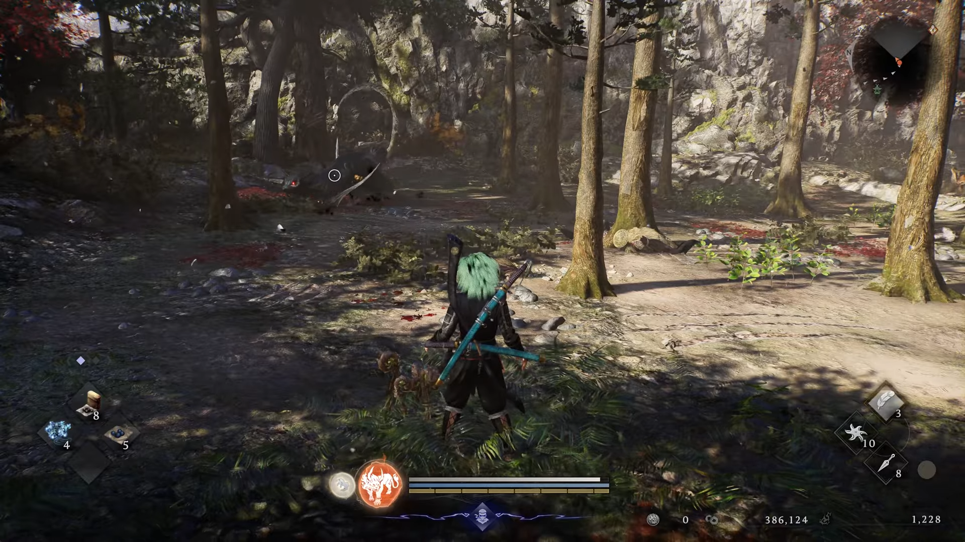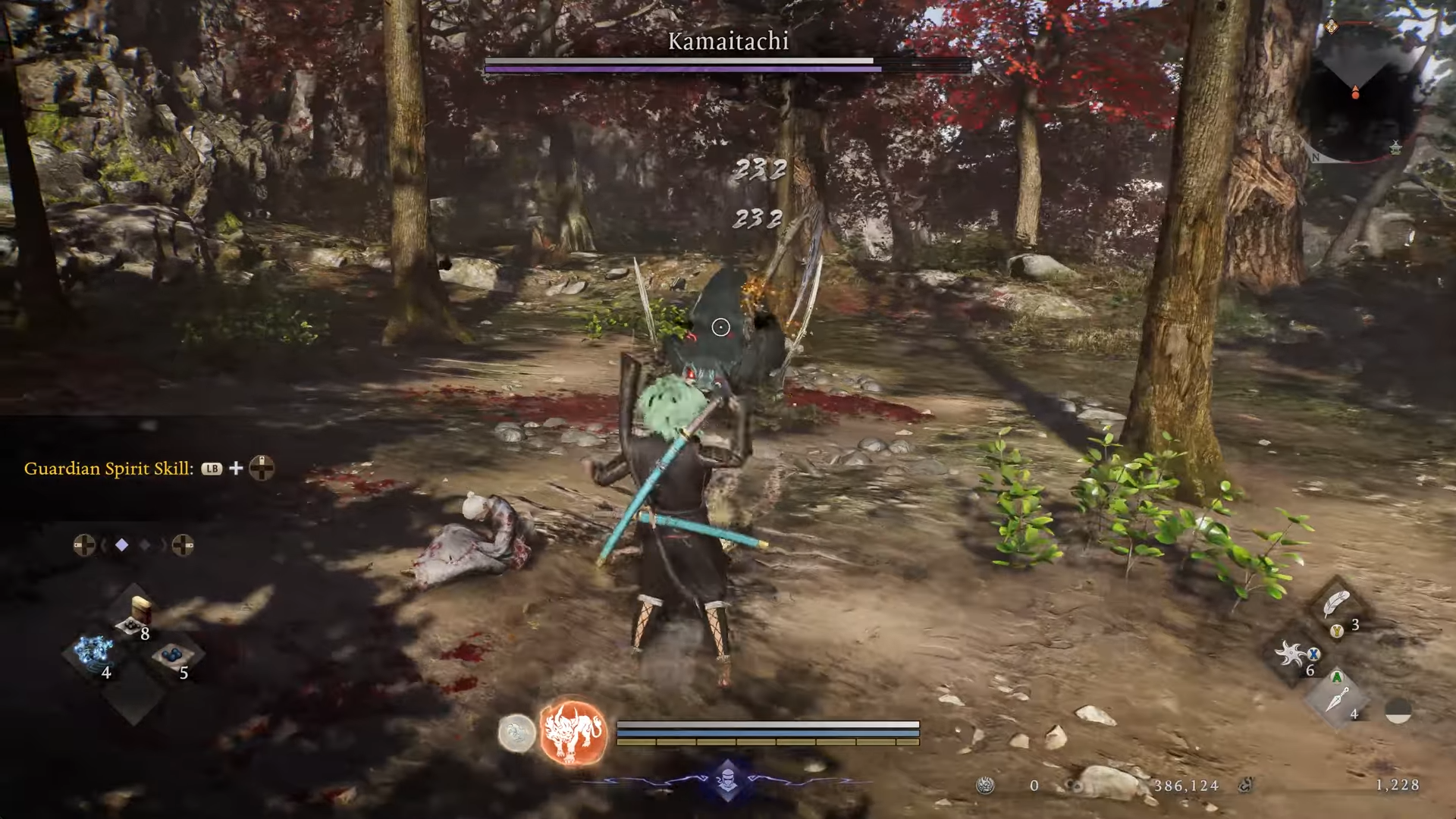 Approach Maisaka Junction shrine in Warring States. Scan the nearby wooded clearing for Kamaitachi patrolling. Hide in bushes until it passes, then creep behind for a free grapple attack to chunk its health early.
