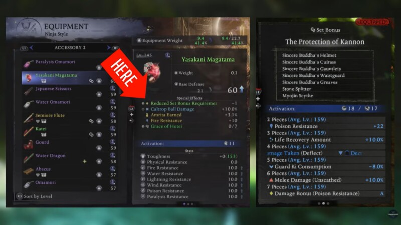 One of the most impactful accessories in NG+ is the Yasakani Magatama. This item reduces set bonus requirements by one piece, making it easier to activate powerful armor or weapon set bonuses.