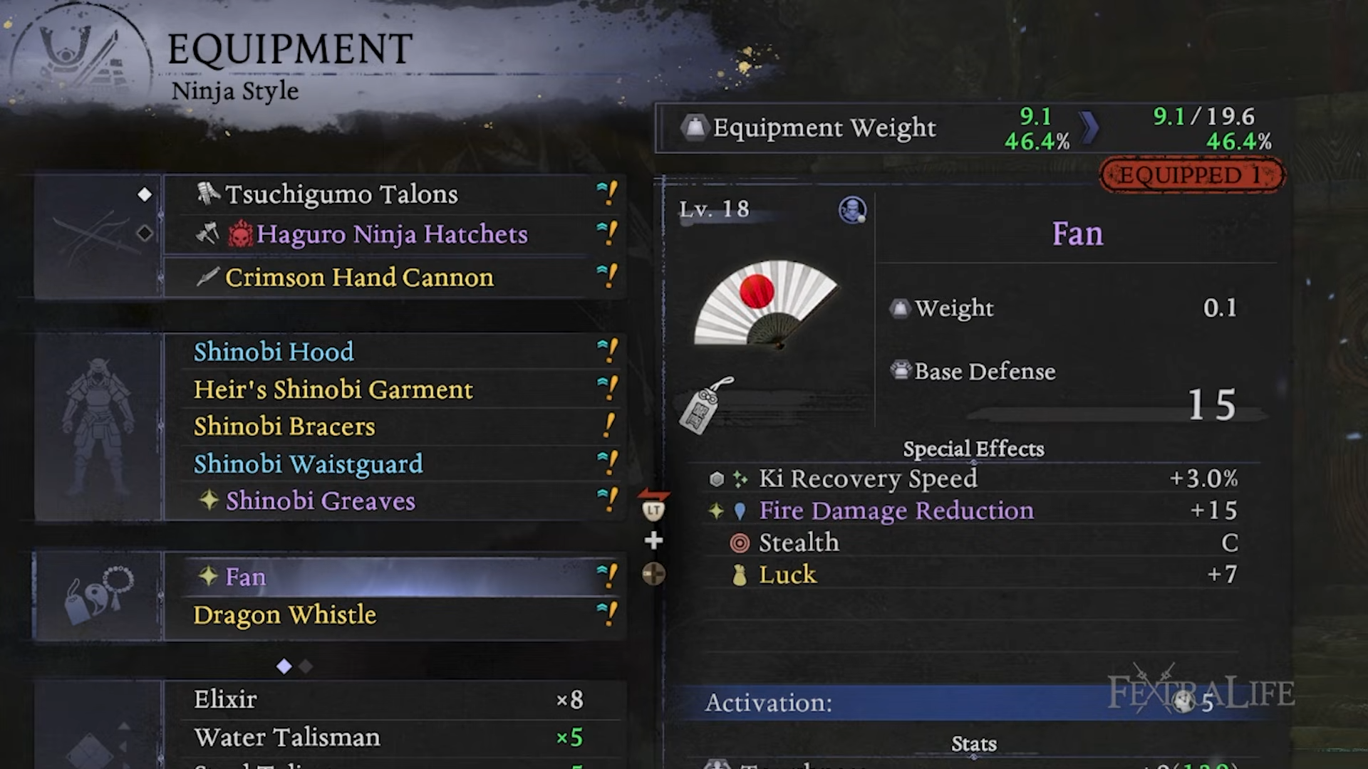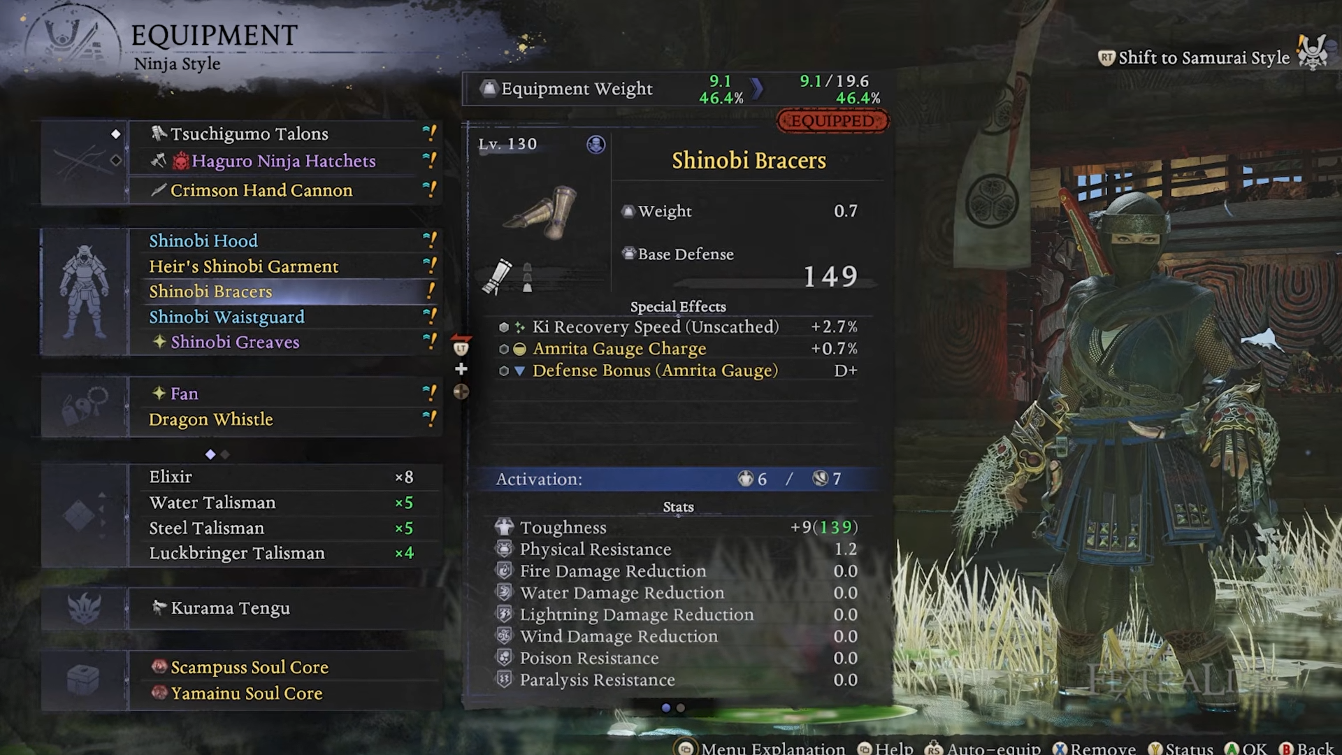 - Heavier damage option: Shinobi gear pieces that boost backstab damage (great for Ninja Style), but be careful because going too heavy can push you into slow agility if you exceed 70% encumbrance.