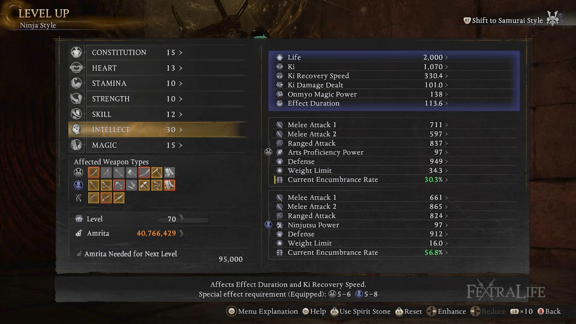 - Your main scaling stat is Intellect, with small early investments into Heart for extra ki.