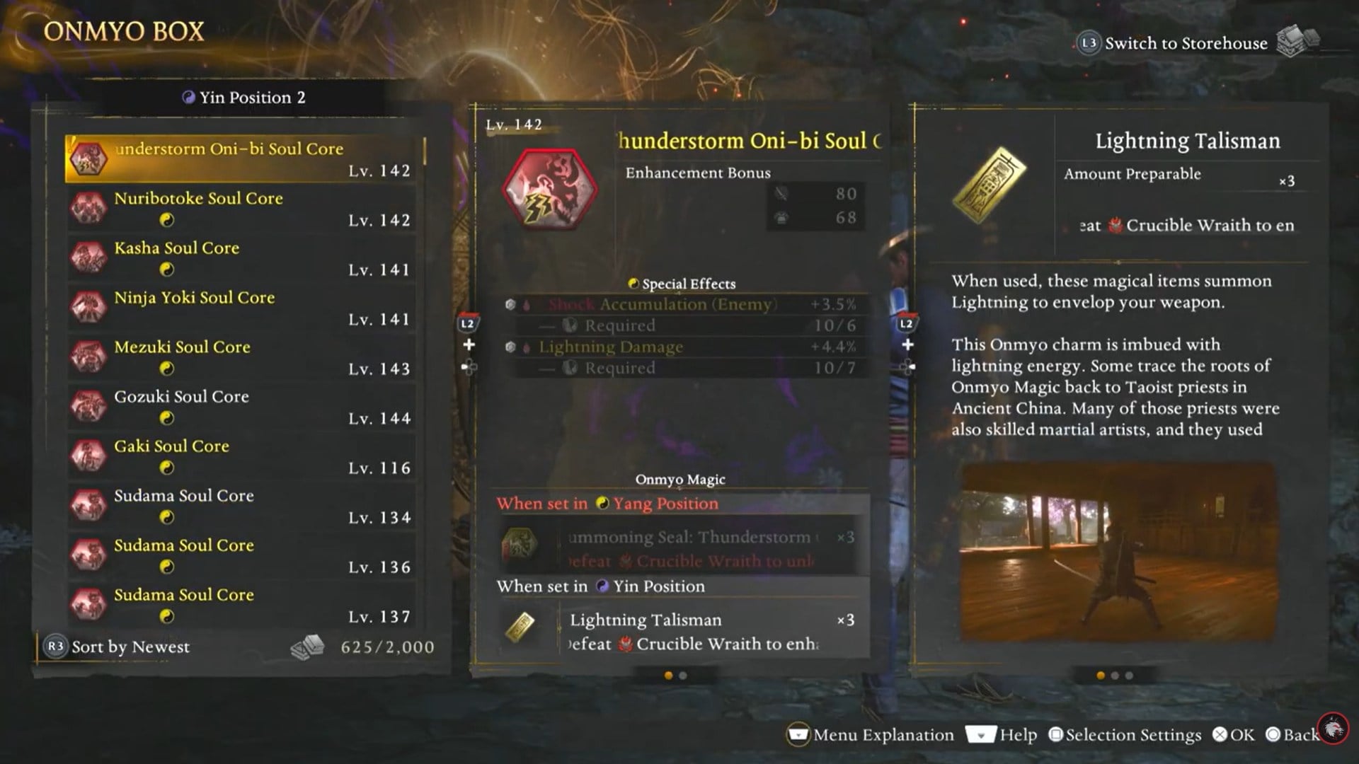 Lightning Talisman in Nioh 3 is unlocked by farming the Thunderstorm Oni-bi Soul Core, assigning it correctly in the Yin Position of the Onmyo Box, and preparing charges through your magic capacity.