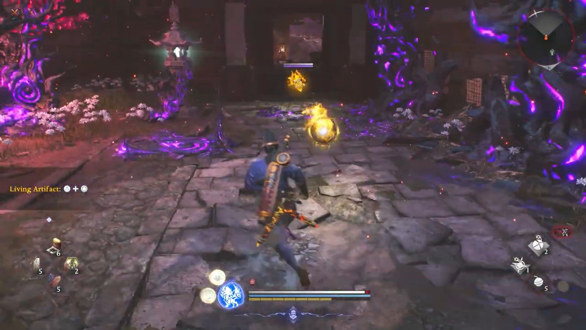 Shock status reduces enemy movement speed and makes them easier to punish. In practice, this creates safer openings, especially against aggressive yokai and fast humanoid bosses.