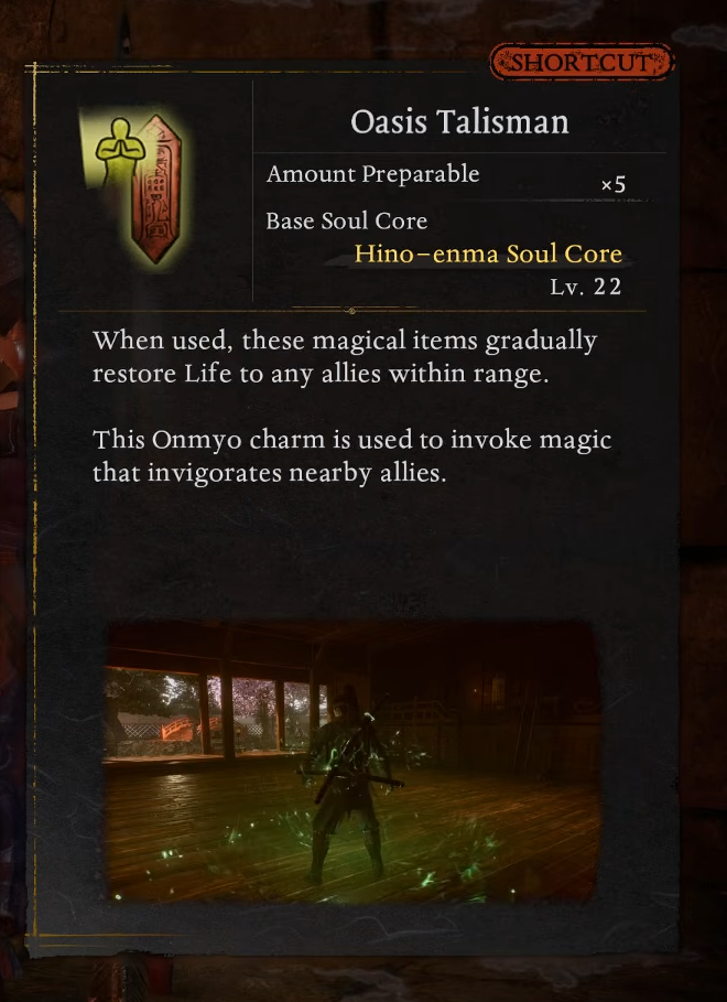 Talismans sit in your soul core inventory, are mapped to a D‑pad button, and use a shared Onmyo Magic gauge that scales with your Magic stat and passive skills.