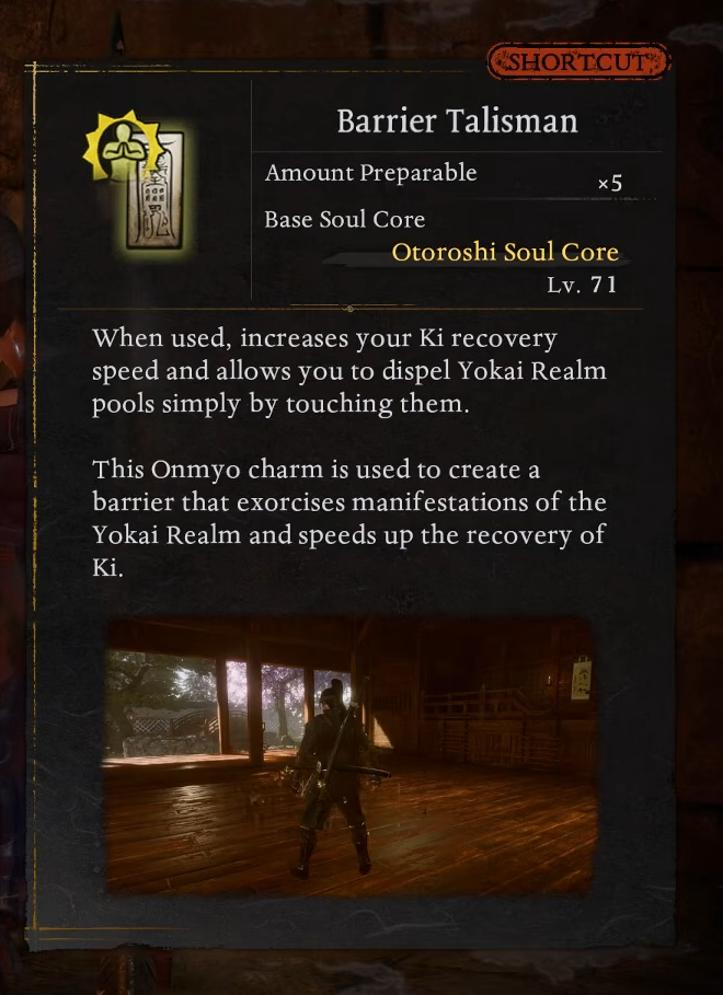 Kekkai (Barrier) Talisman – Creates a purification field that clears Yokai Realm effects and boosts your Ki‑regen inside it.