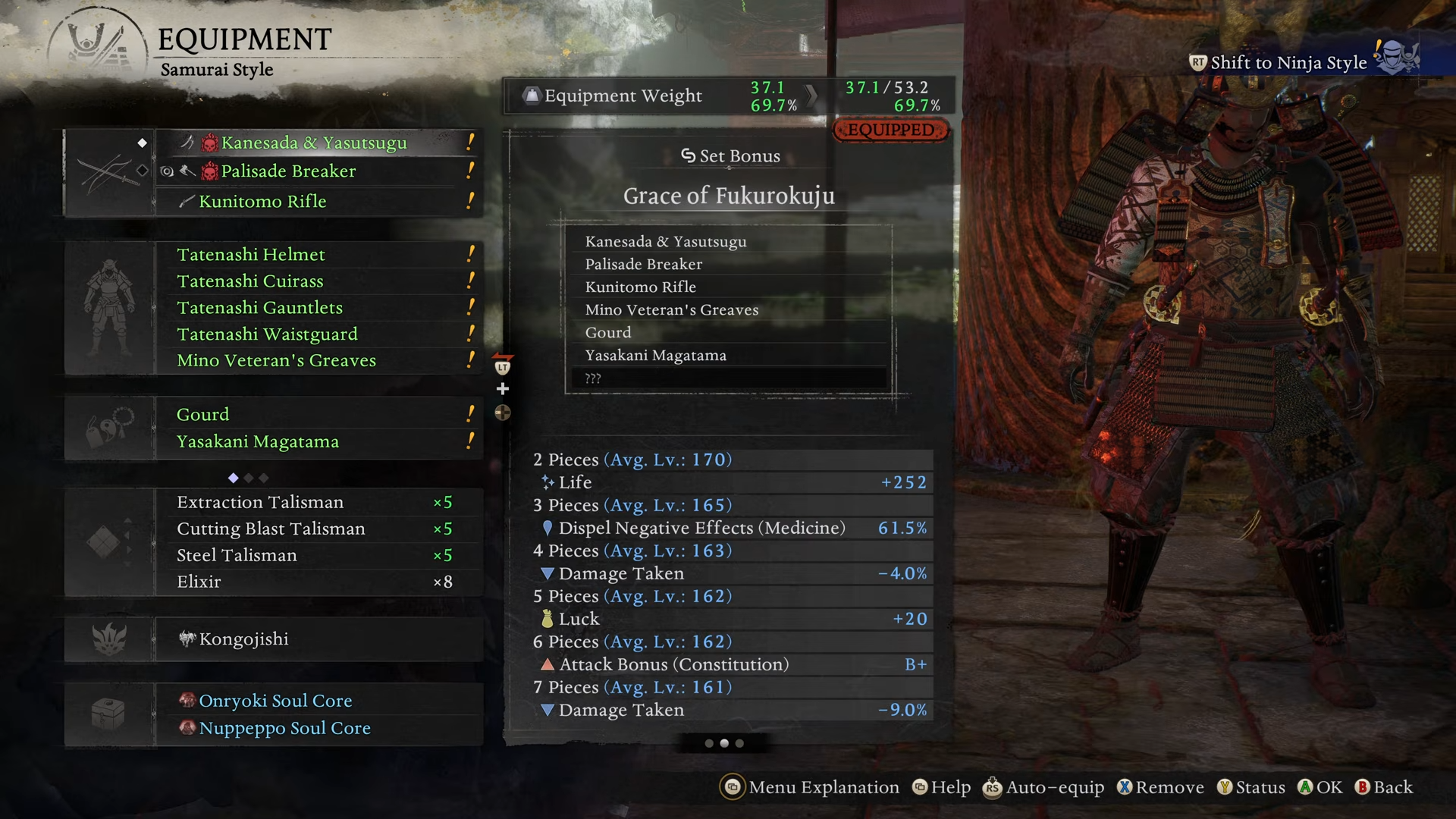 Main armor sets Fukuroku set plus Tatanashi (God of War Looks Down) pieces