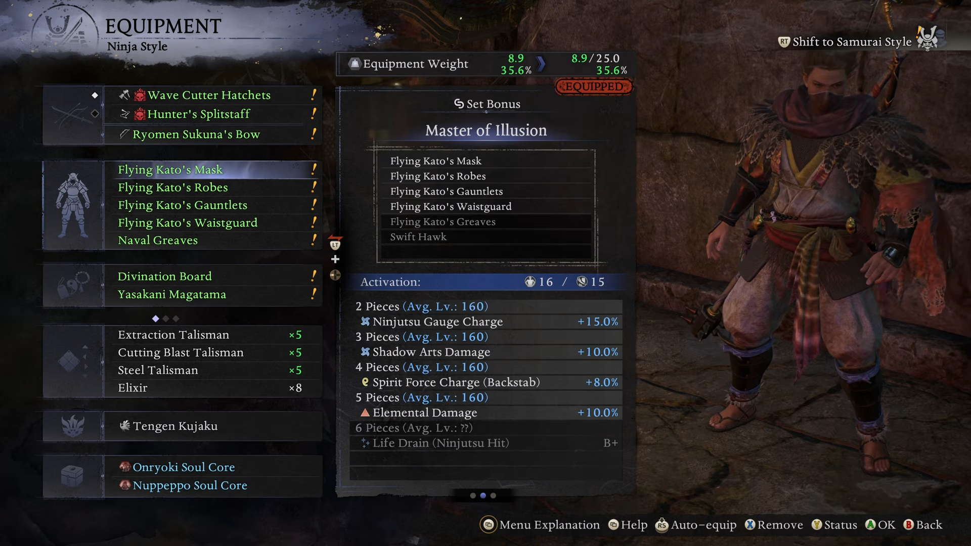 • Maintain the Anari Kato gear and ninjutsu from your previous setup as an alternate configuration.