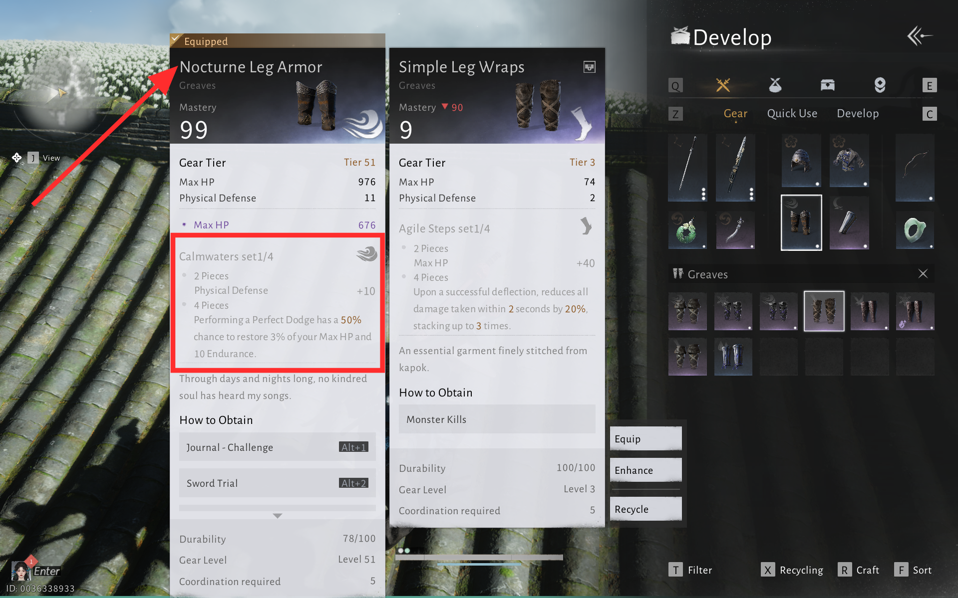 Equipping any two Calmwaters pieces (such as Nocturne Leg Armor plus another Calmwaters item) grants a flat increase to Physical Defense. This is a small but always‑on boost that makes you a bit tankier as soon as you hit two pieces.