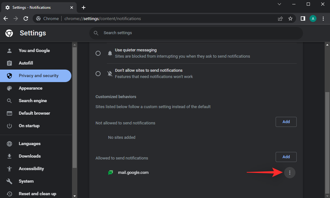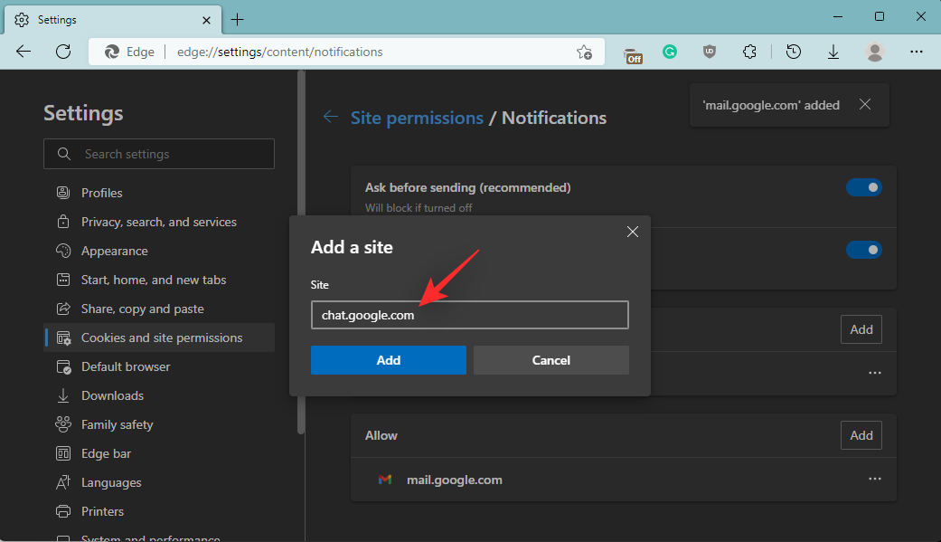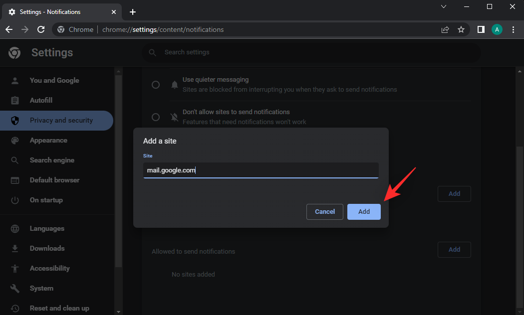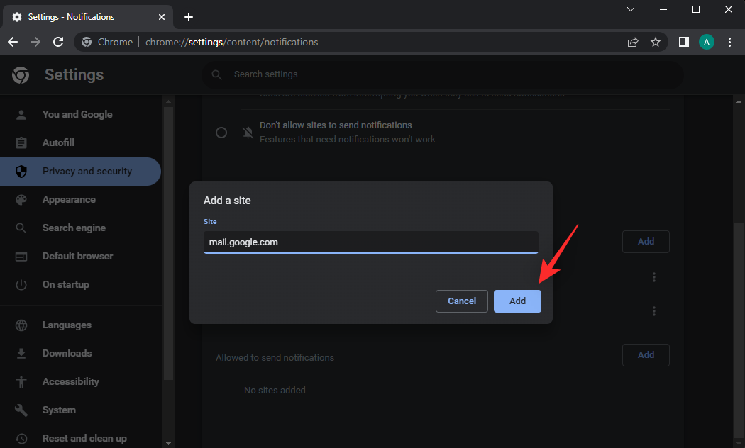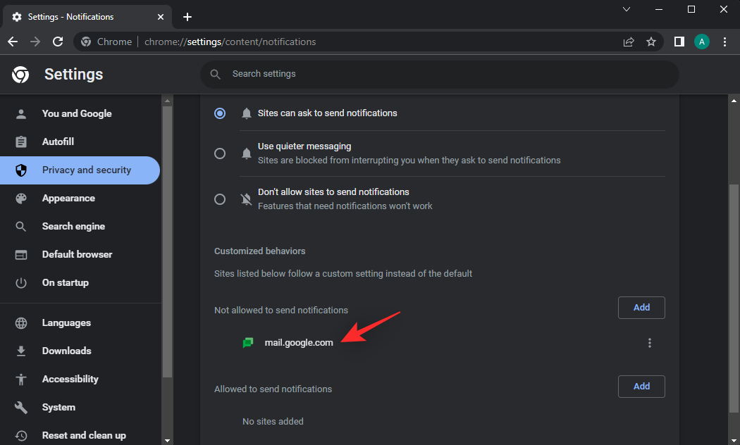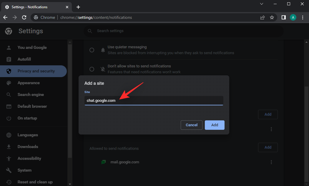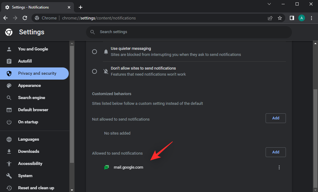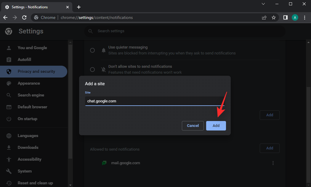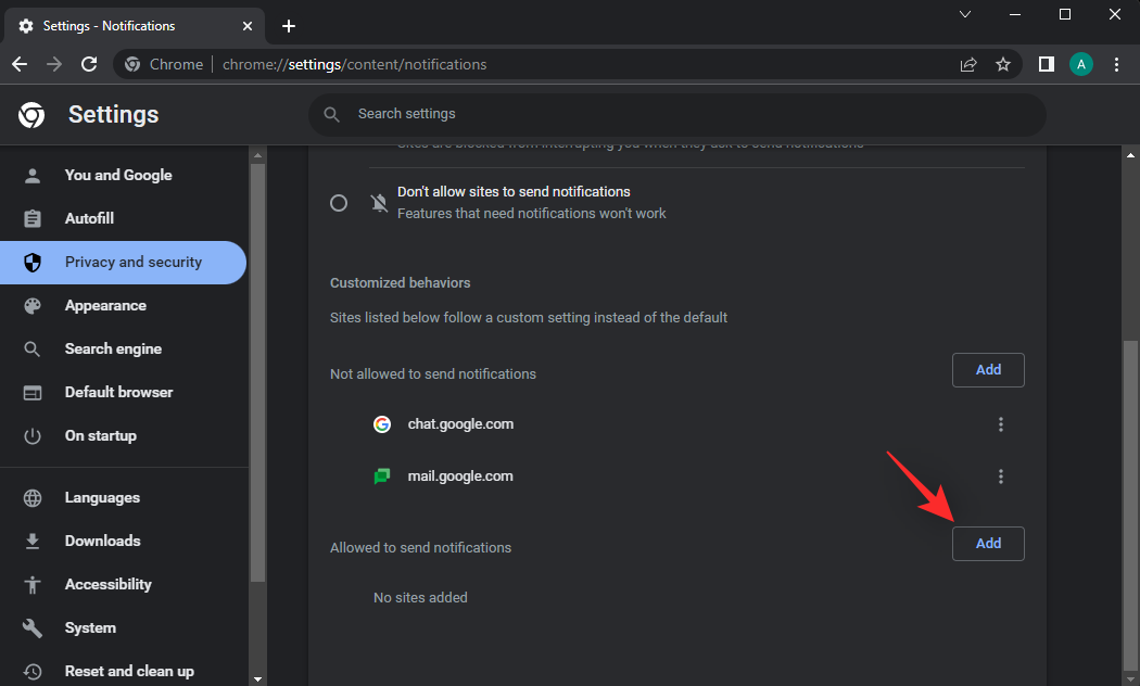 Notifications will now be disabled for Google Chat. Restart Chrome on your system, and visit Chrome notification settings again. Click Add beside Allowed to send notifications.