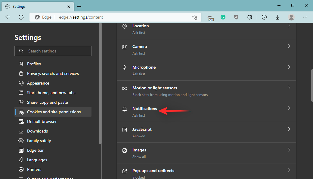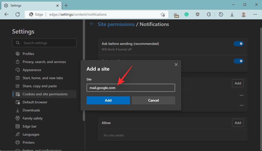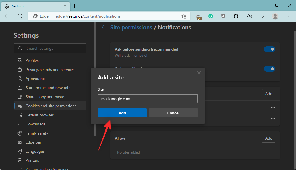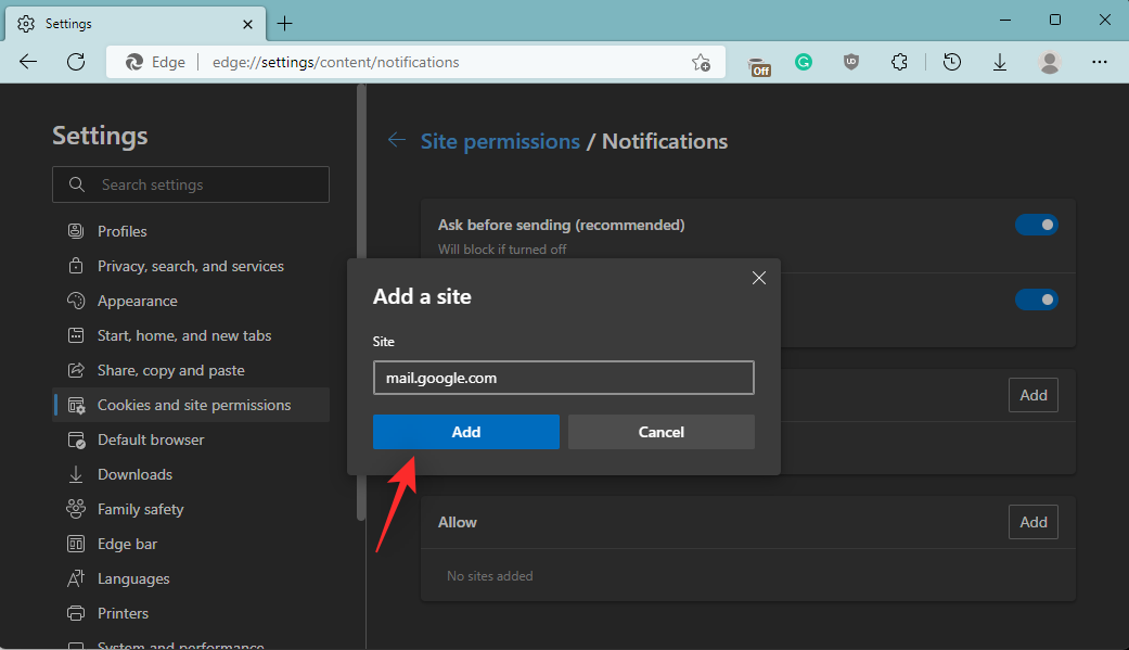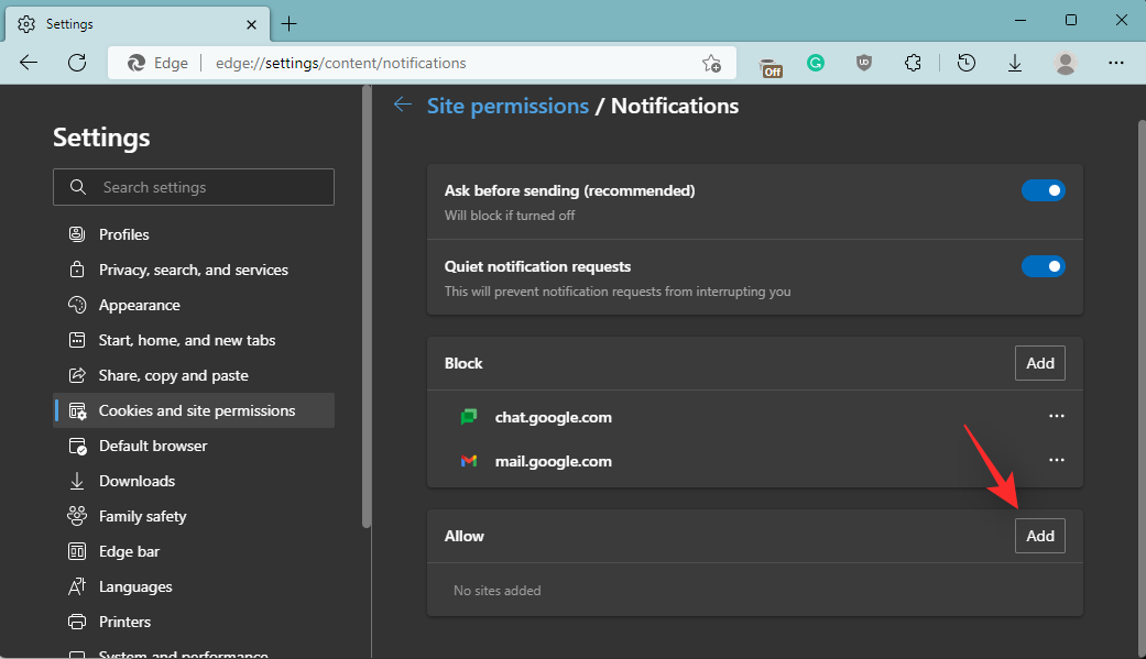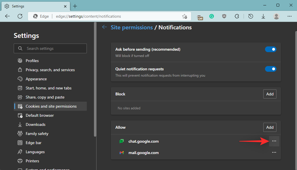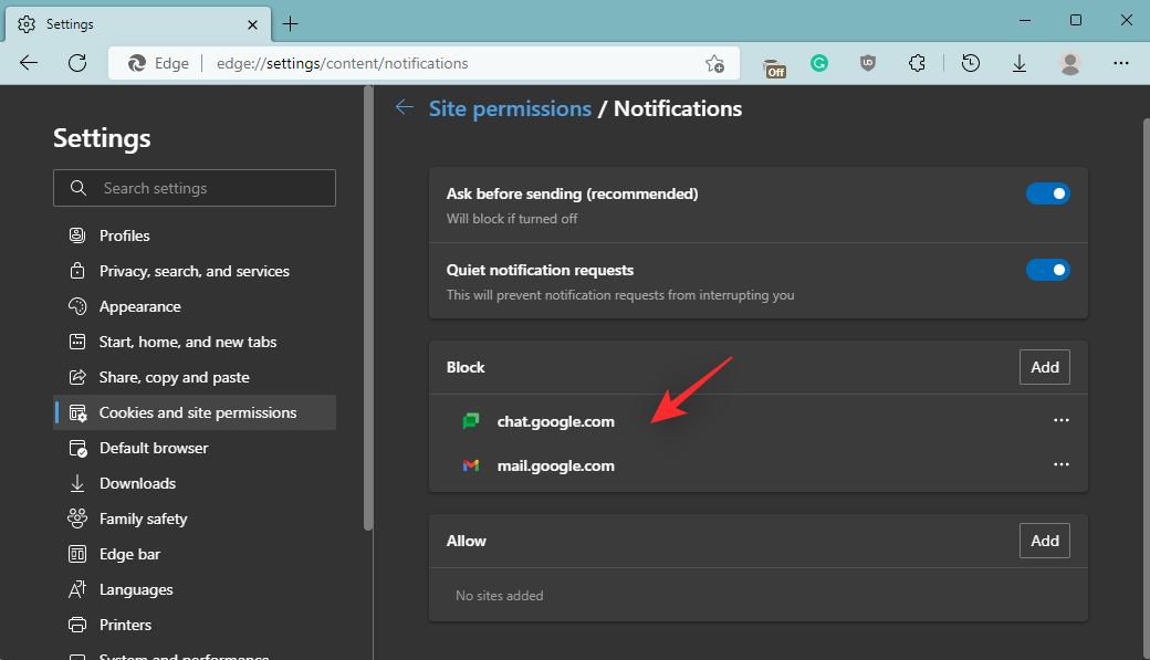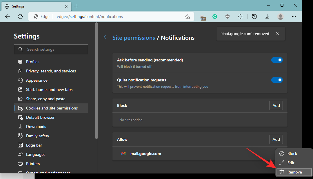 Continue removing the necessary addresses using the steps above. Once done, restart Edge and visit notification settings again.
