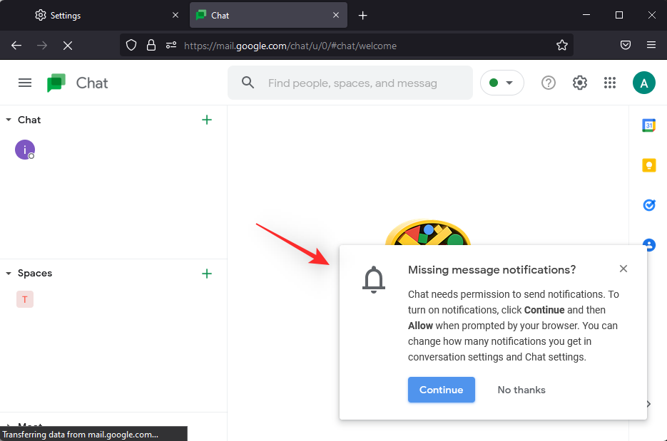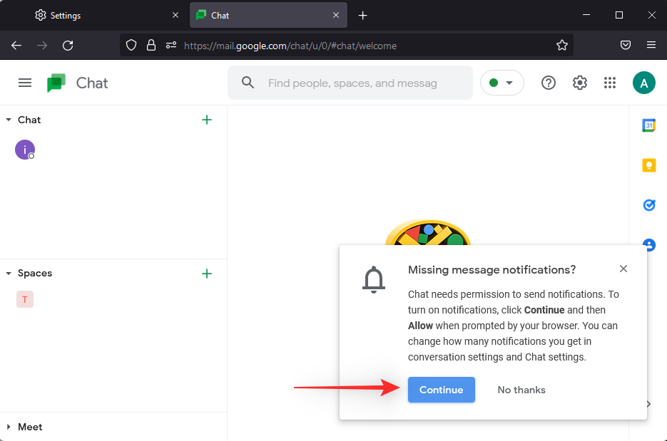 Start by visiting Google Chat using this link. You will now be asked to opt-in for notifications. Click Continue to opt-in for the same.