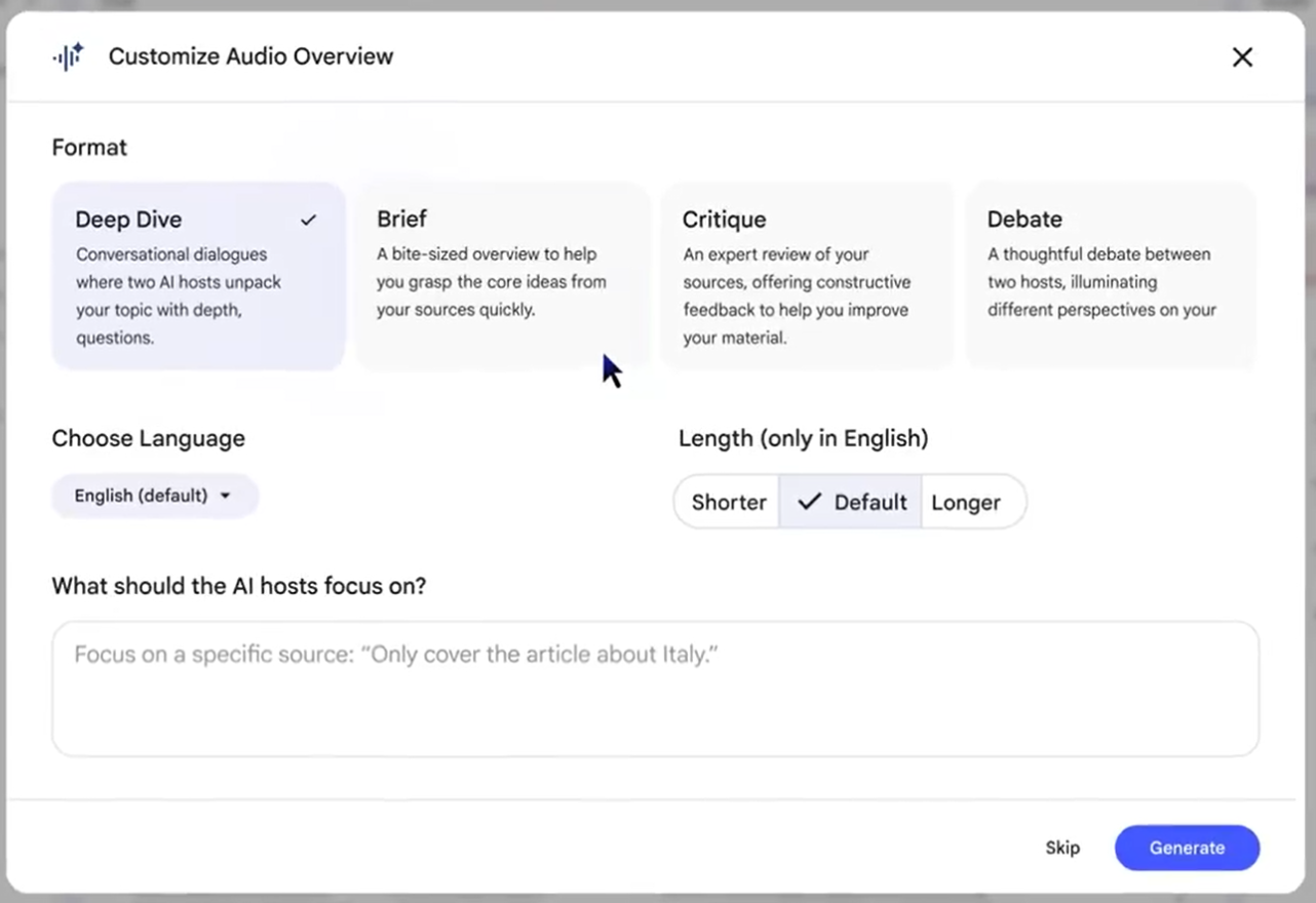 Since its inception, users have relied on NotebookLM to turn their sources into engaging, AI-driven audio discussions. Now, Google is giving you even more flexibility. Rather than sticking with the same conversational “Deep Dive” format, you can choose one that fits your needs—whether you want speed, feedback, or a discussion of opposing views.