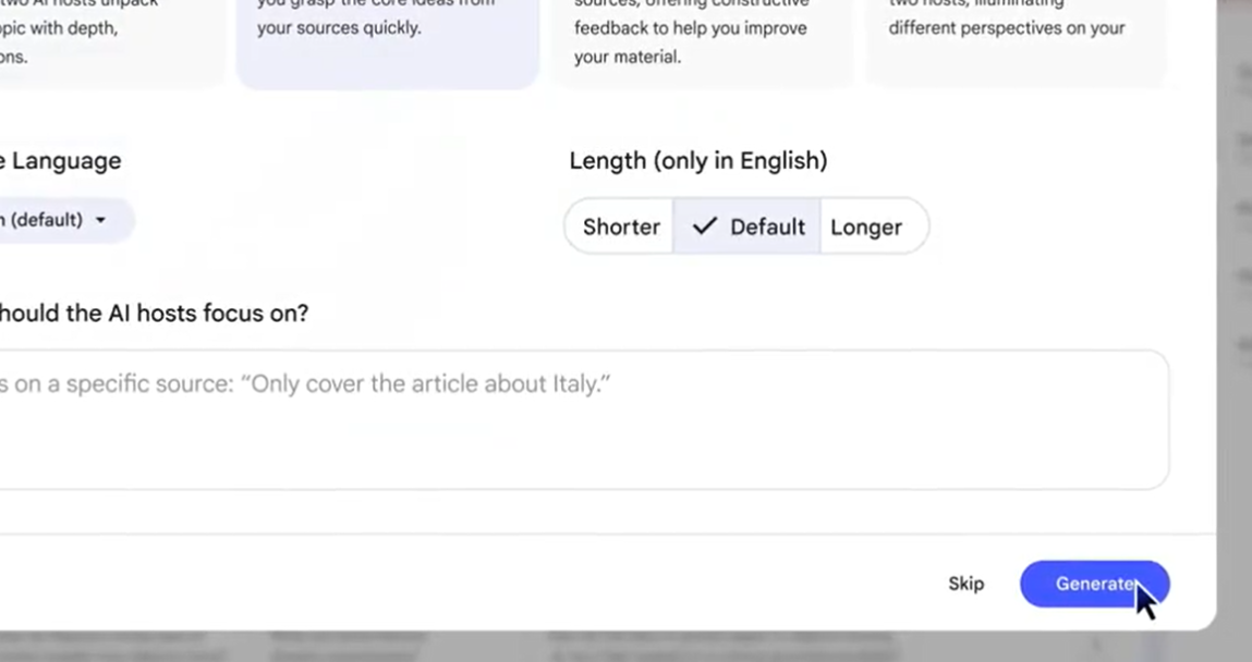 Use Debate when you want to explore different angles. Two AI hosts—each taking a side—discuss your sources in a back-and-forth style, illuminating diverse viewpoints.