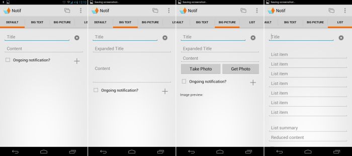 Developed by Eric Carboni, Notif is compatible only with Android devices running Android 4.1 Jelly Bean, as the app borrows from the expandable notifications feature of the OS. The app has a clean and elegant UI, and is easy to use even for first-timers. Once you launch the app, you have the option of selecting from four different types of notifications.