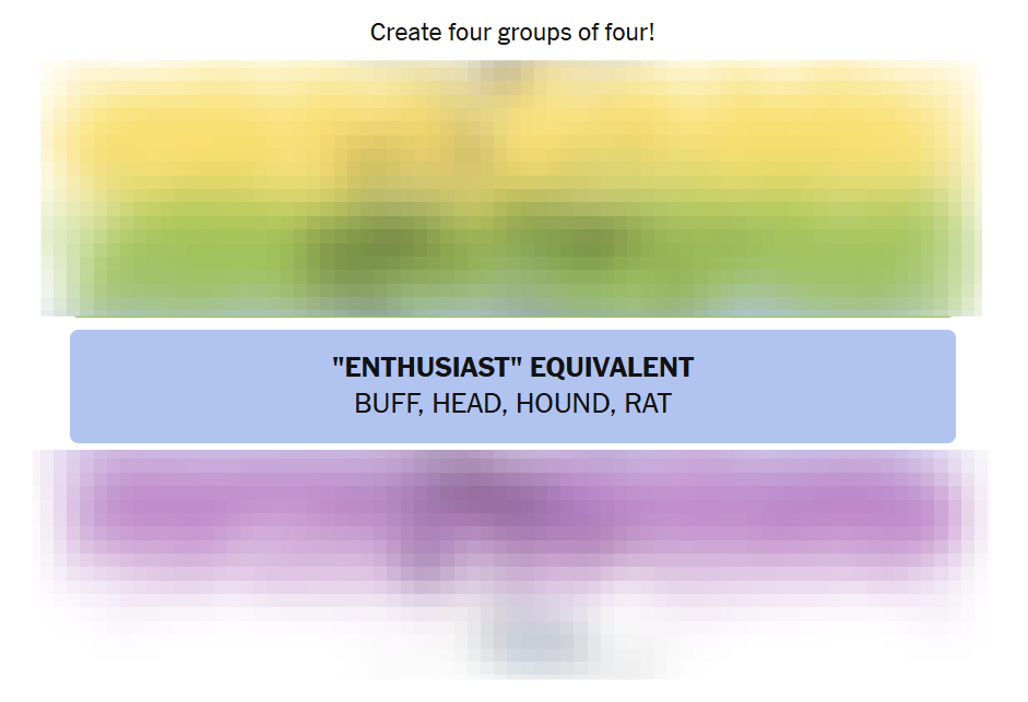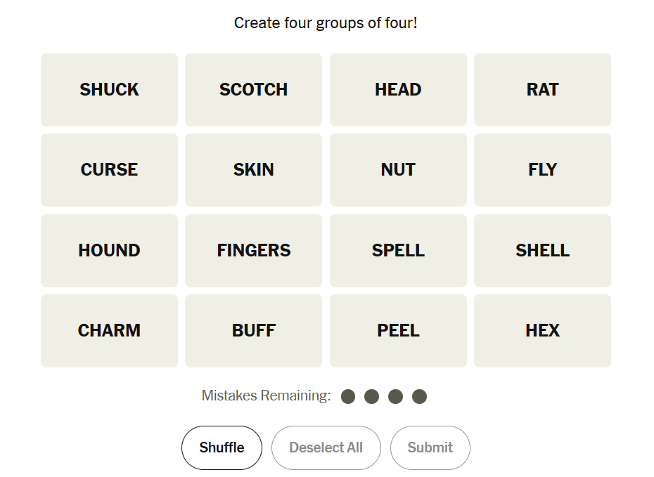 Today’s grid leaned heavily on flexible language—words that shift meaning depending on context. Some categories felt straightforward, while others hid behind informal usage or common expressions. Many solvers likely cracked one or two groups quickly, only to slow down as remaining words started to blur together.