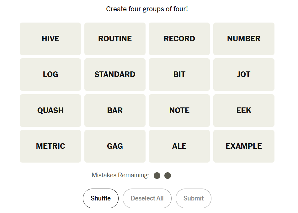 Today’s grid leaned heavily on language and interpretation, mixing literal actions with abstract ideas and a playful final category. Many solvers likely cruised through the first couple of groups before slowing down on the more deceptive wordplay, especially toward the end.