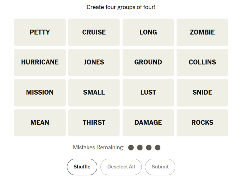 This puzzle had a balanced mix of straightforward synonyms and more thematic groupings. Some categories relied on tone or intent, while others required recognizing phrases or compound meanings. The overlap between certain words made mis-grouping easy, especially if you didn’t spot the underlying pattern early.