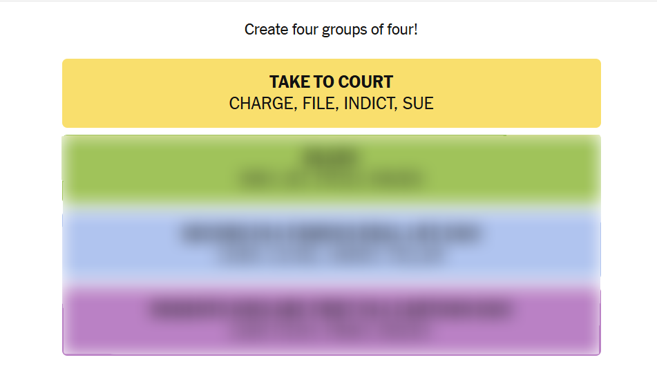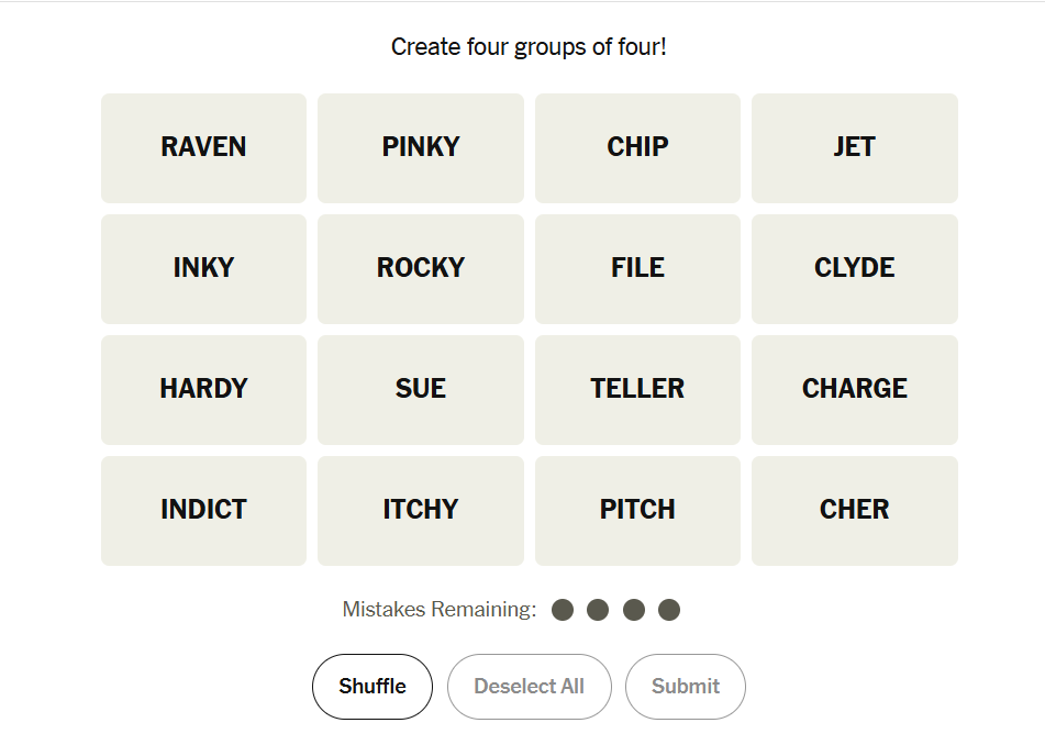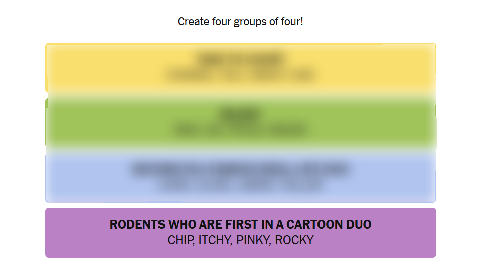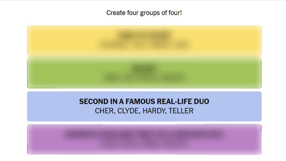 This puzzle thrives on cultural knowledge and wordplay, making it a moderately challenging but rewarding experience. Start by identifying the legal terminology group, as courtroom vocabulary tends to be most straightforward and familiar to general audiences. Next, recognize the color descriptors—all variations of black—which becomes clearer once legal terms are removed. The two duo categories require more specific knowledge of entertainment history and animation. The key is distinguishing between real-life famous partnerships and cartoon characters. Pay attention to avoid the Pac-Man ghost trap: while INKY, PINKY, and CLYDE appear in the puzzle, they don't belong in the same category.