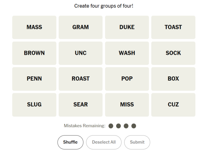Today’s grid blends language from different contexts — cooking, family slang, geography, and action words. Some groups feel straightforward once spotted, but the puzzle also includes words that could belong to multiple themes, which may slow solvers down before the right connections click into place.