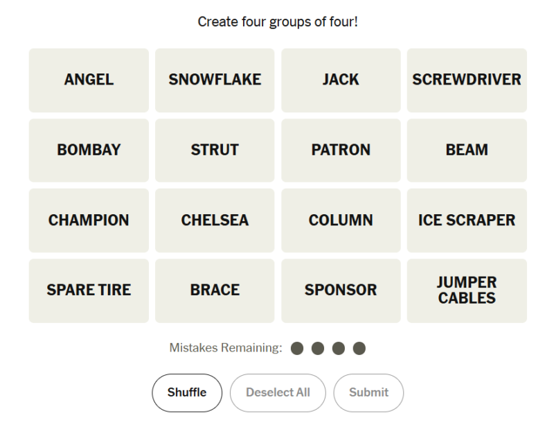 This puzzle had a balanced feel, combining tangible, everyday items with more abstract connections. One category leaned on physical objects, another on roles or people, while a trickier group required noticing a shared ending pattern. Many solvers likely found early wins before slowing down on the more subtle associations.