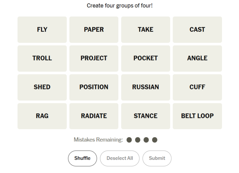 Today’s grid leaned into a balance of literal and conceptual groupings. Some categories were grounded in physical objects you could easily visualize, while others played with meanings and interpretations. The mix created a satisfying challenge where one or two groups likely clicked quickly, but the remaining ones required careful thought and elimination.