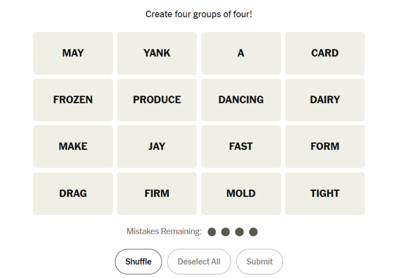 Today’s puzzle leaned into clean vocabulary groupings with a mix of verb synonyms, descriptive states, shortened sports references, and a themed phrase completion. Solvers likely found at least one category quickly, but the final grouping required recognizing a consistent word that follows each clue. A balanced and enjoyable grid overall.