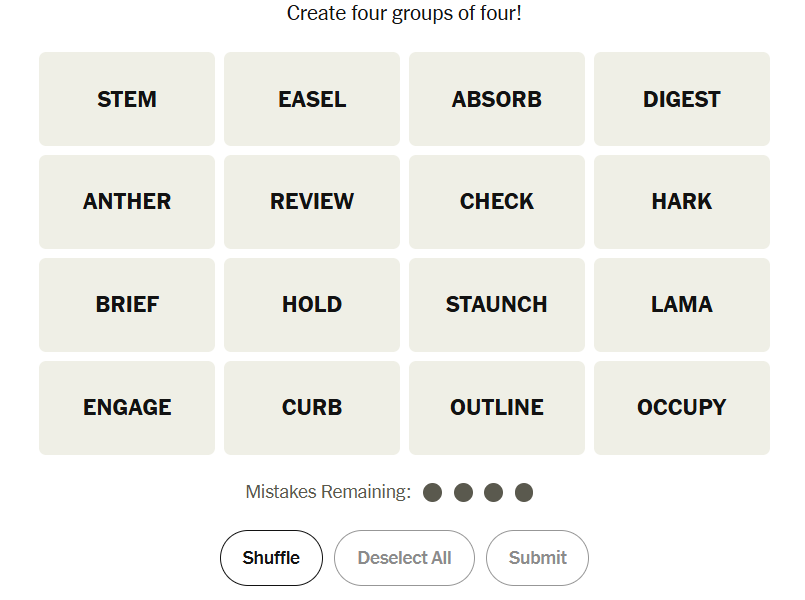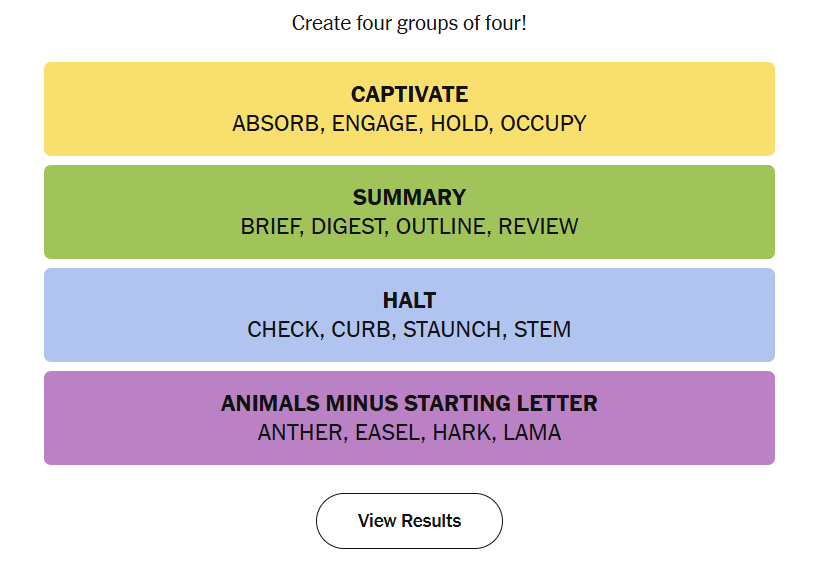 Today’s Connections puzzle blended language, logic, and creativity in perfect harmony. From being absorbed and engaged to trimming thoughts into a brief review, then shifting gears to check or curb the flow — it all led to a playful finish with hidden animals minus their opening letter.