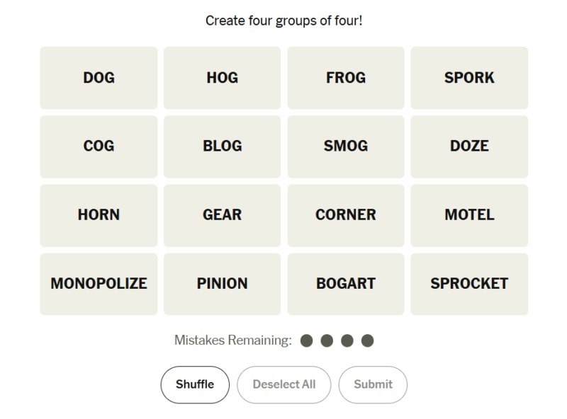 Today’s puzzle had a satisfying mix of vocabulary and concept-based groupings. One category leaned into mechanical objects, another involved blended words, and a particularly sneaky group depended on adding the same word before several clues. Many solvers likely spotted one or two groups quickly but needed a bit more thought to untangle the rest.