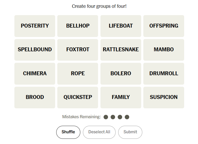Today’s grid felt clean and well-balanced, mixing concrete categories with playful word construction. Some groups stood out quickly, while others required slowing down and thinking about structure rather than meaning. Overall, it was a satisfying puzzle that rewarded patience and careful elimination.