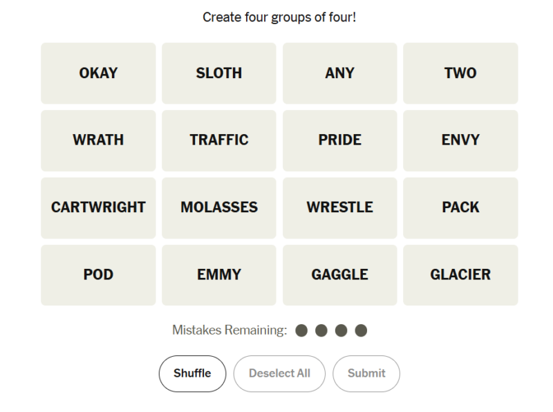 Today’s Connections puzzle leans heavily into verb-based thinking and lateral associations. Some groupings feel intuitive, while others rely on spotting patterns beyond surface meanings. The anagram set is especially tempting early on, while the final category rewards solvers who recall classic childhood games.