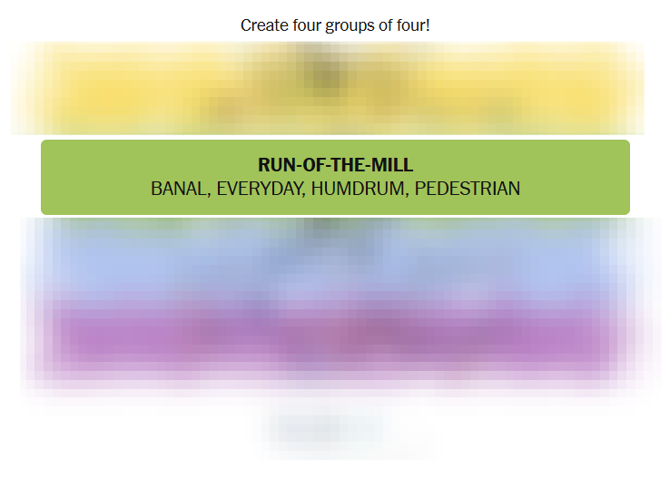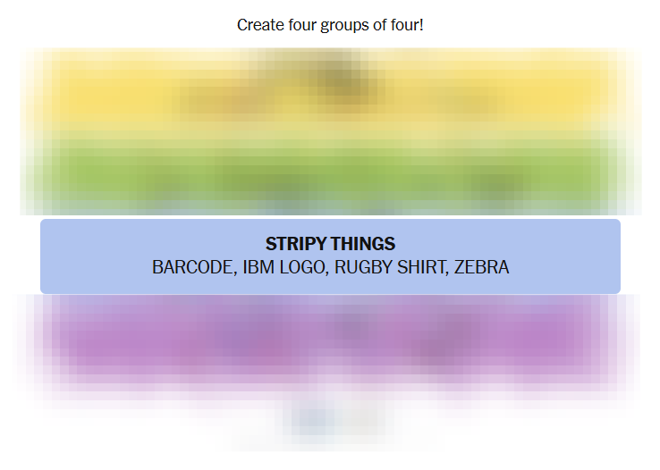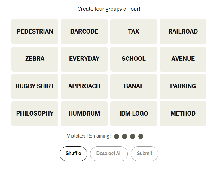 Today’s grid blended literal categories (things you’d see on a board game) with descriptive clusters (words meaning ordinary or commonplace) and visual items (striped patterns and logos). Solvers who alternated between meaning and imagery likely found different groups clicking into place at different times.