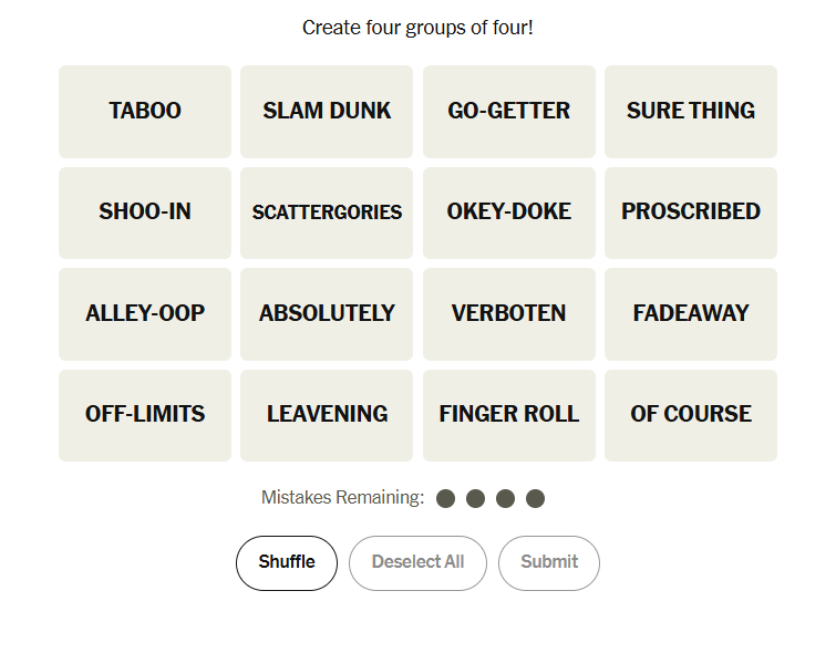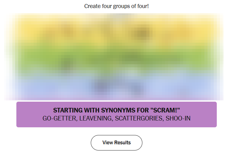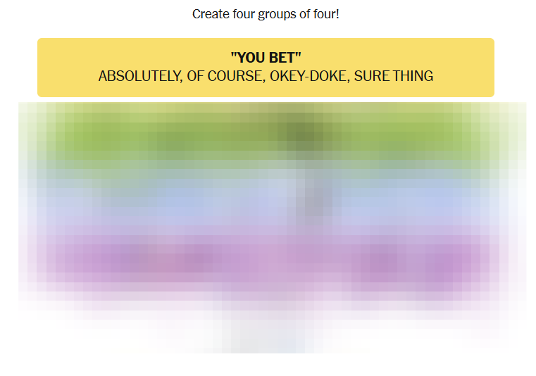 Today’s puzzle was a satisfying mix: two straightforward synonym sets and two groups that rewarded noticing phrase starts and register (sports vs. colloquial). It felt fair — not too obscure, with a neat “aha” on the last set.