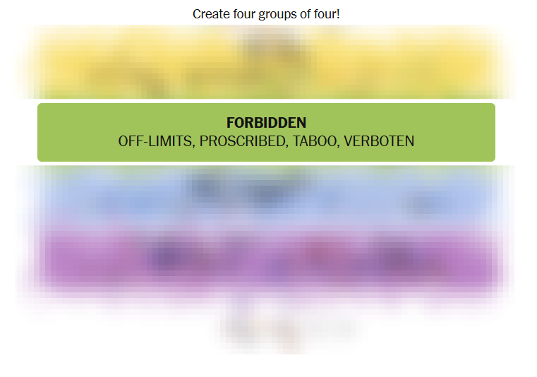 Today's grid paired very literal synonym clusters with two more playful sets. One group was unapologetically colloquial; another relied on recognizing words for "forbidden." Solvers probably flew through the obvious synonyms and hesitated briefly on the phrase-start category.
