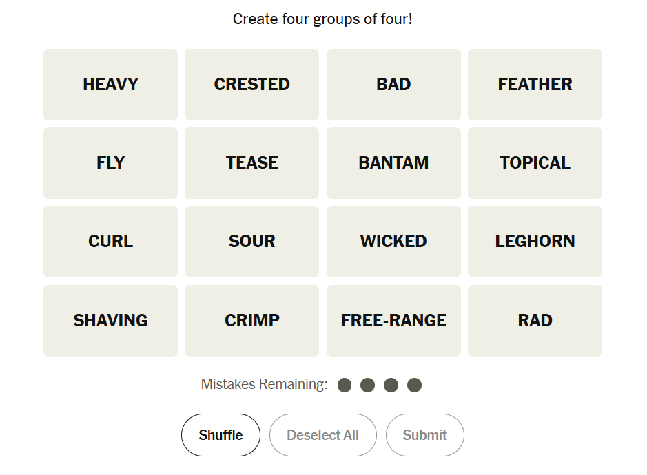 Today’s board had a distinct retro feel, with one category rooted in vintage style and another drawing from old-school slang. Alongside those were two more straightforward descriptive sets, though each still required careful sorting. Many solvers likely locked in one theme quickly before juggling a few trickier overlaps to finish the grid cleanly.