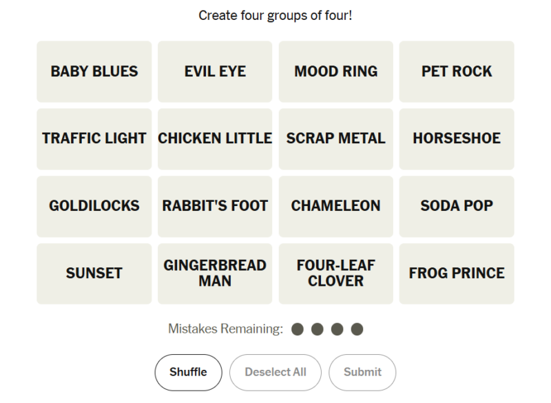Today’s puzzle leaned into recognizable themes, mixing cultural references with visual and conceptual clues. Solvers likely found one or two groups quickly, but the remaining sets required careful thinking. The overlap in meaning and phrasing made this grid moderately tricky, especially when distinguishing literal from figurative connections.