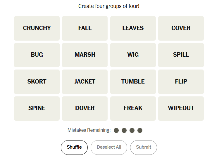 Today’s NYT Connections puzzle is a tidy, feel-good mix: words about falling, book anatomy, frantic “out” expressions, and a playful chocolate-bar letter trick. Two groups are literal and pictureable, one is all about idiomatic energy, and the last is a tiny letter puzzle — the kind that makes solvers smile when it clicks. Start with what you can picture, say the “out” verbs out loud, and the rest follows.