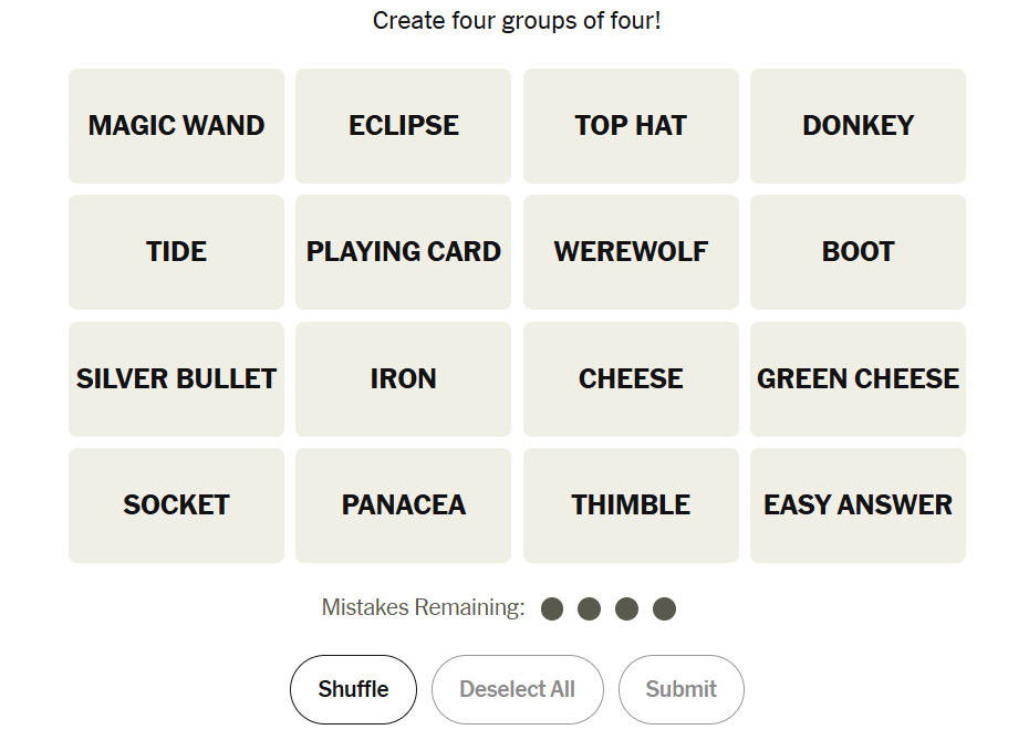 Today’s grid leaned into familiar phrases and well-known associations. Some categories were straightforward once spotted, while others required thinking about pop culture or common expressions. A couple of words cleverly fit multiple ideas, making careful grouping essential. Overall, it was a balanced challenge that rewarded broad knowledge and flexible thinking.
