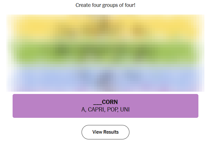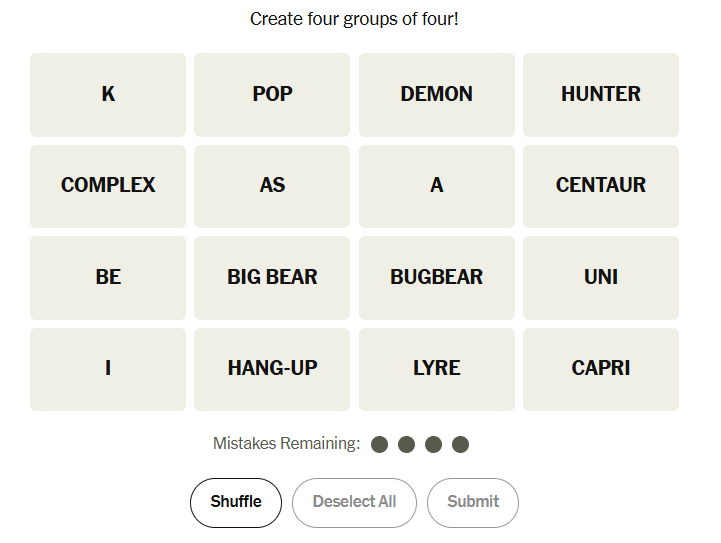 Today’s NYT Connections is a neat little mix of wordplay and imagery: one category is emotional/psychological annoyances, one is literal constellations, one is atomic shorthand, and the last is a fun “___ corn” wordplay set. Two groups are pictureable (constellations and the corn phrases), one lives in your head, and one rewards reading letters as chemical symbols.