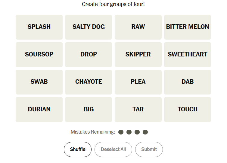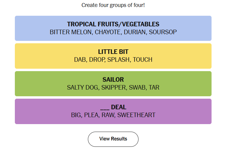 Today’s puzzle blended recognizable themes with a few trickier associative jumps. The grid leaned on tropical ingredients, small quantities, nautical terminology, and a set of expressions that complete a shared phrase. Many solvers likely spotted one or two groups quickly, while others required a closer look to catch the more abstract pairings.
