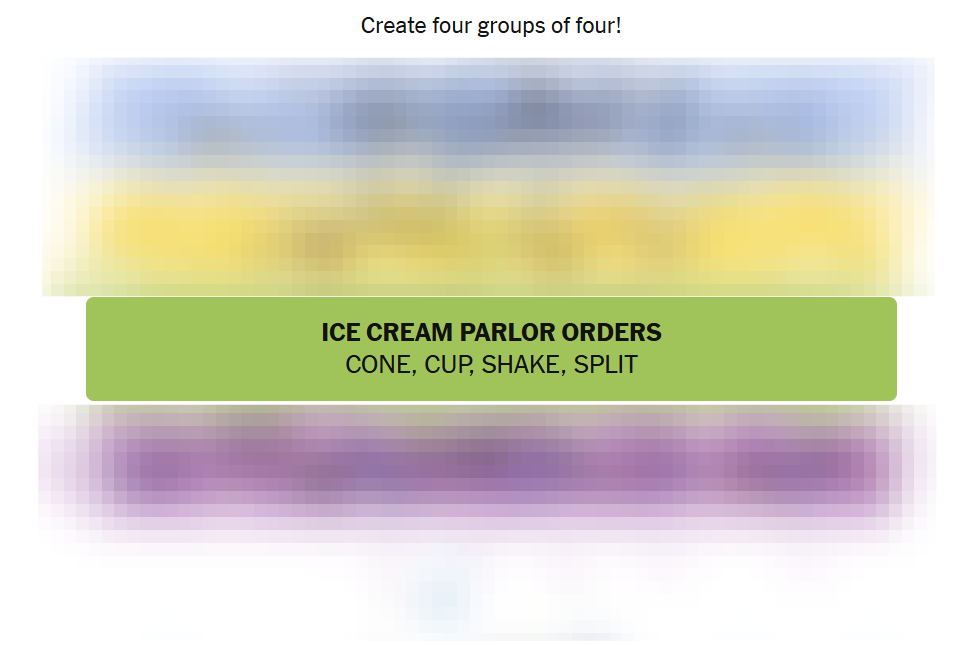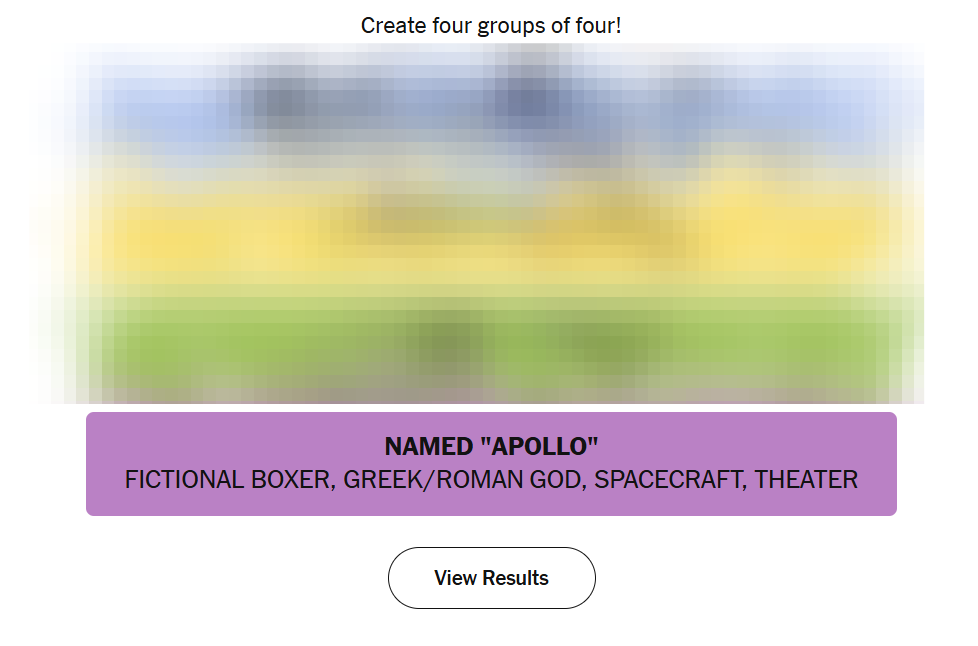 Start with the Ice Cream group — those food words stand out quickly. Then move on to the movies (look for “The”). Save the “Apollo” group for last, since it blends abstract categories like gods, spacecraft, and theaters.