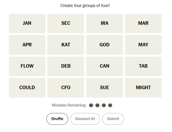 Strategy tip: When a group feels inconsistent, try reversing, splitting, or rearranging the words—Connections loves hiding patterns in plain sight.