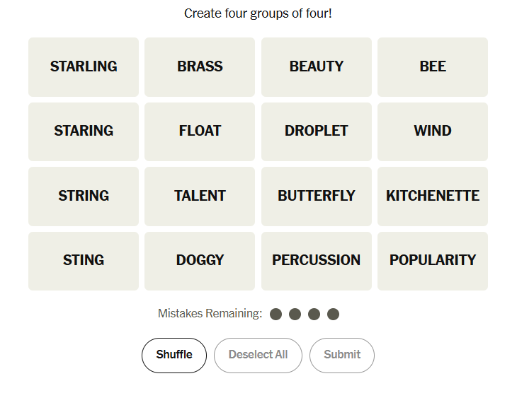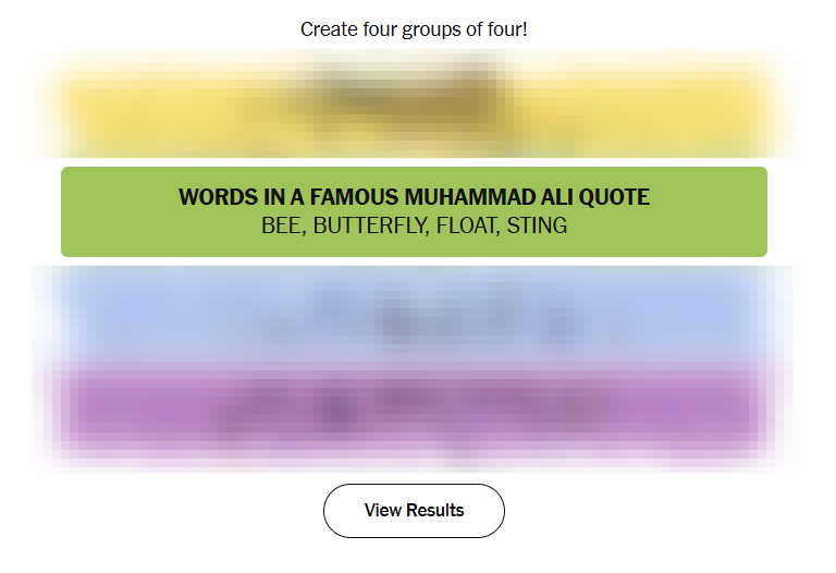 Today’s NYT Connections puzzle is clean, crisp, and absolutely satisfying — four clear themes that reward both imagery and a little wordplay. We’ve got musical families, a famous Ali line chopped into parts, contest types you can picture, and a cheeky set built from diminutive suffixes. Start with the pictureable groups, hum a little, say words out loud if you need to — the puzzle practically wants you to win.