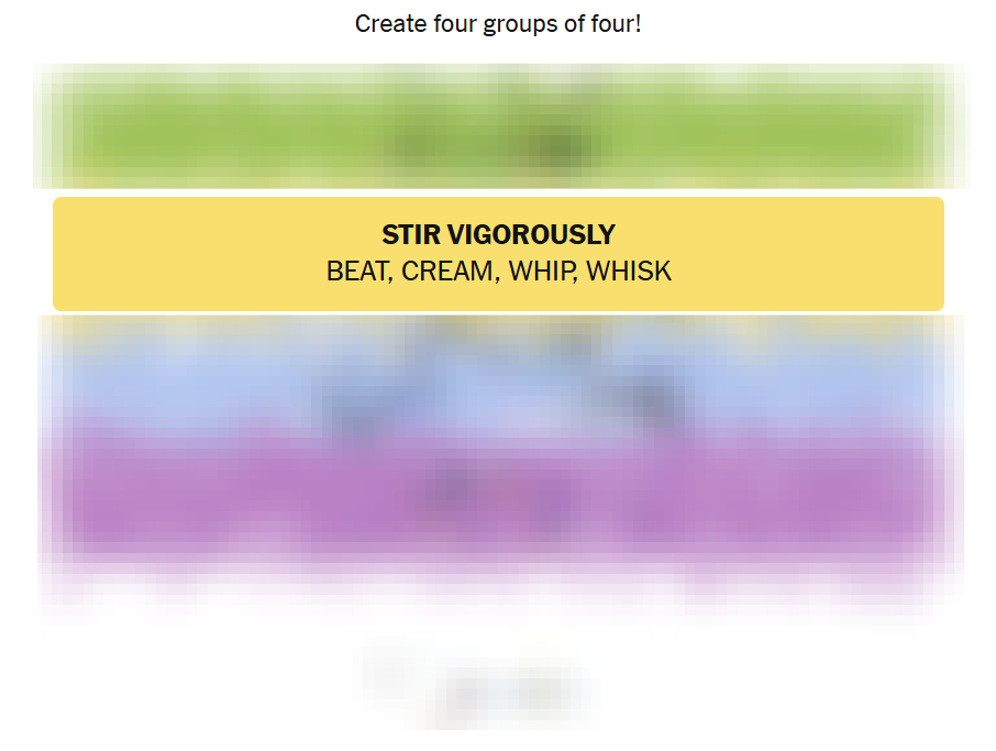 Start with the Stir Vigorously group — kitchen verbs tend to stand out. Then lock in the bears. Save Dirty ___ for last, since it can feel trickier with abstract phrases.