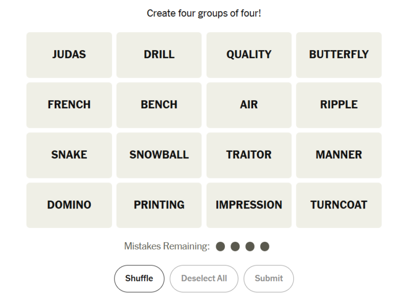 Today’s grid leaned heavily on conceptual connections rather than concrete objects. Solvers likely spotted one emotionally charged category early, while the more abstract “effect” grouping may have required deeper thinking. A satisfying word-structure category rounded things out, rewarding players who considered common phrases instead of definitions.