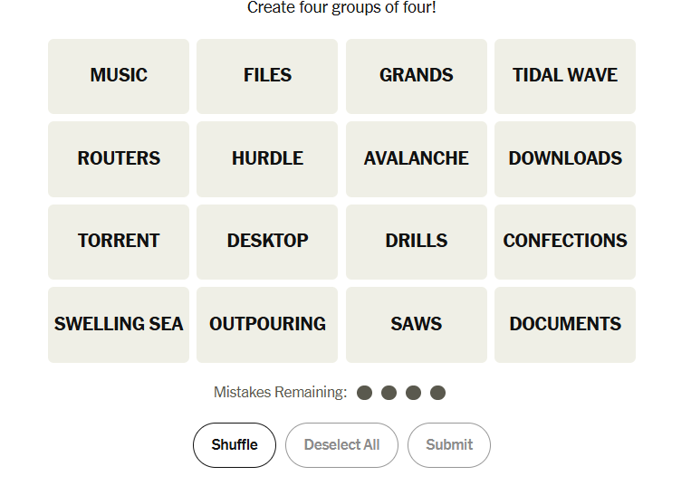 The 27 November grid presented four tidy themes: natural overflow words, common computer folders, woodworking tools, and a playful rhyme set tied to NYT game names. Solvers likely moved quickly on the literal categories but hesitated where phrasing was stretched or poetic.