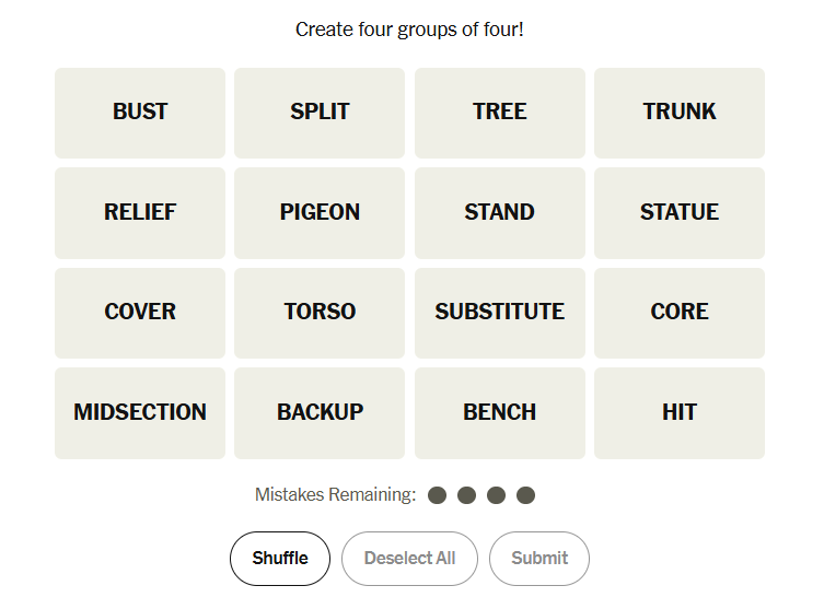 Today’s grid leans into concrete, recognizable themes. Nothing too trick-based—just familiar vocabulary that becomes tricky only when words overlap across multiple plausible categories. Solvers likely noticed some terms that could comfortably sit in more than one group, making careful comparison essential.